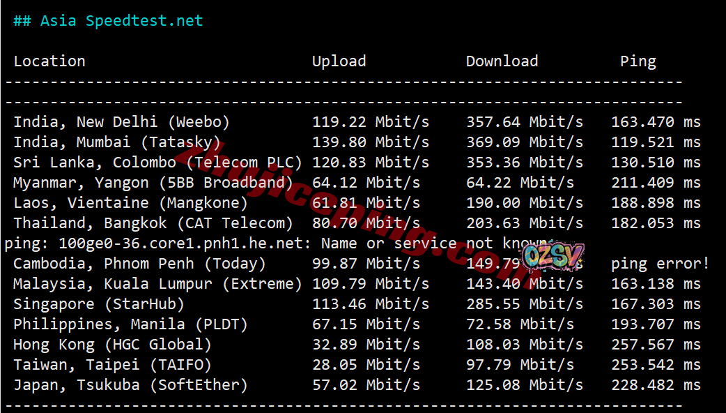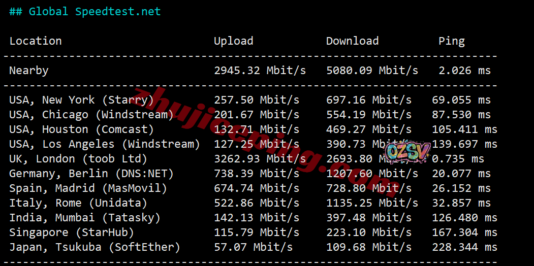 SpeedTest.Net的部分国际节点的带宽上下行测试数据: