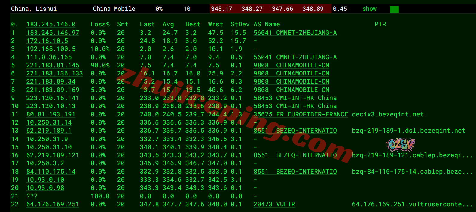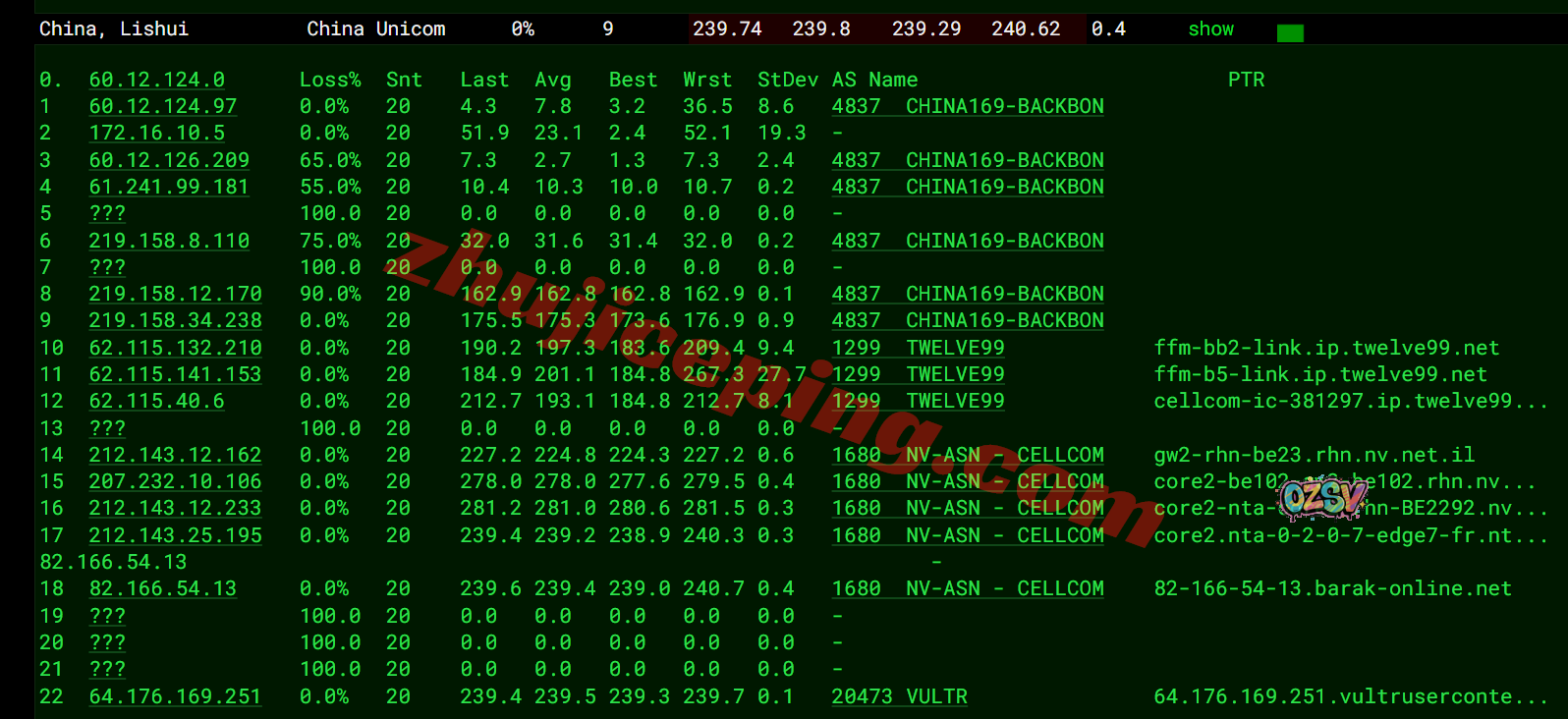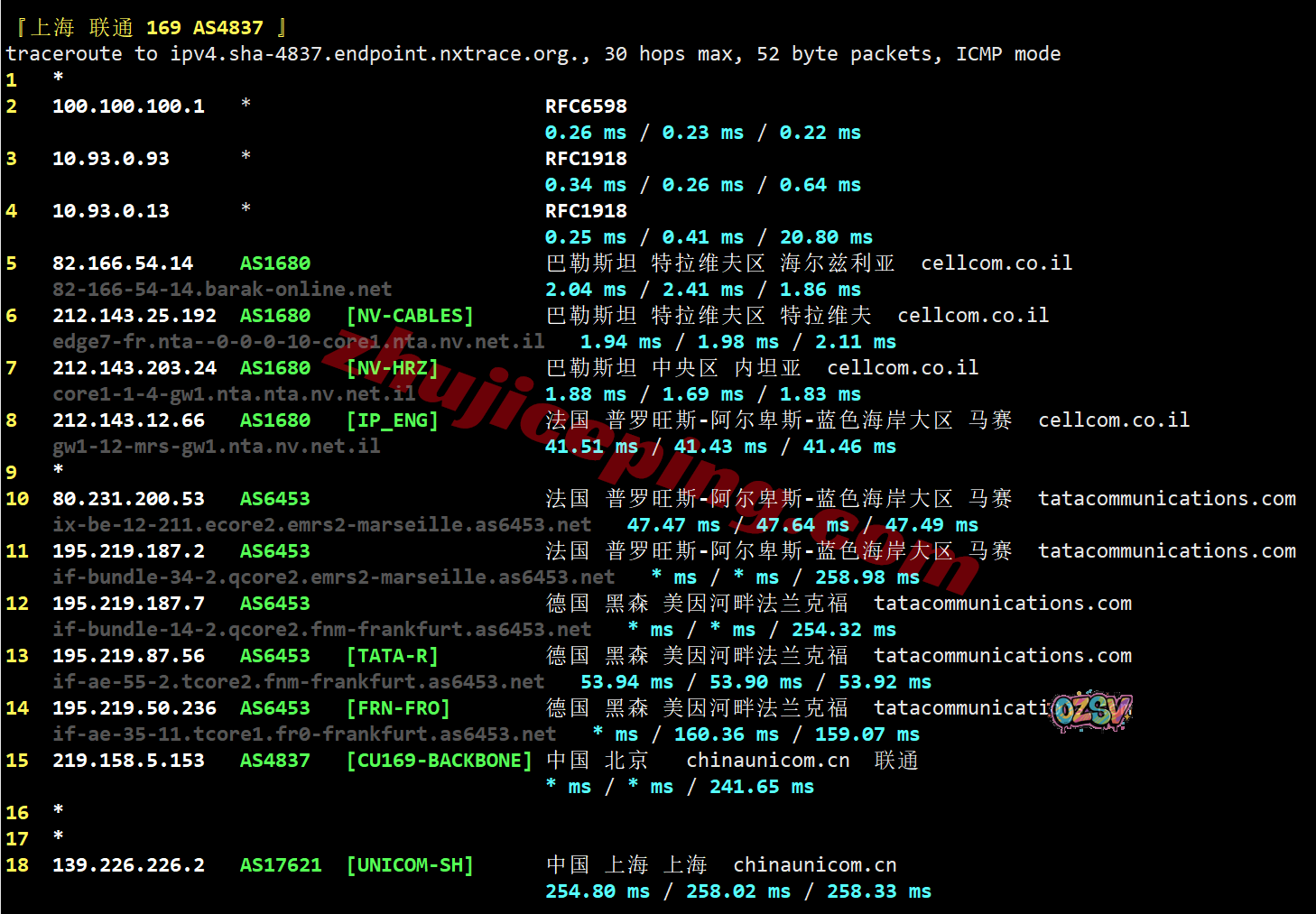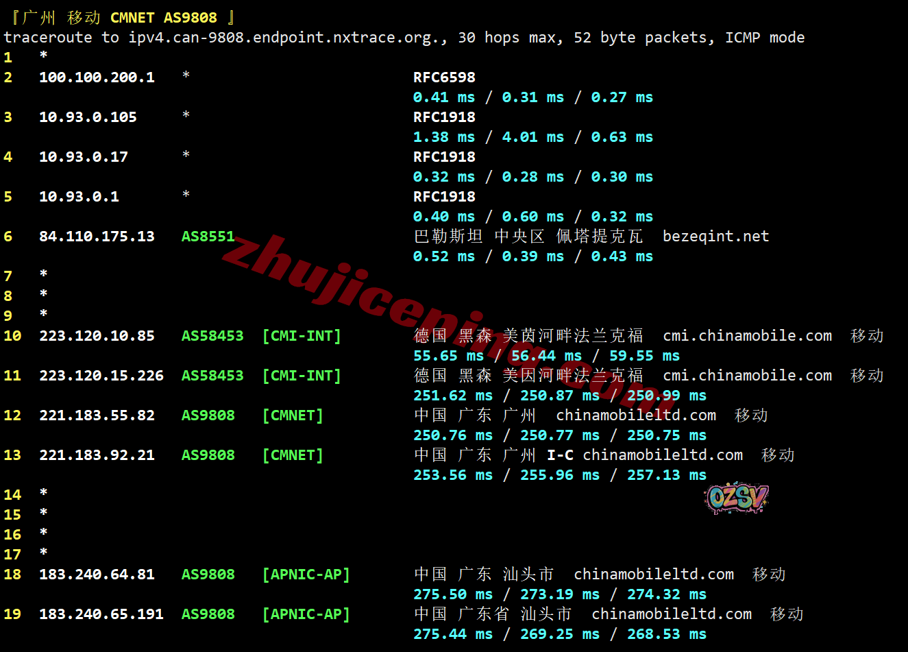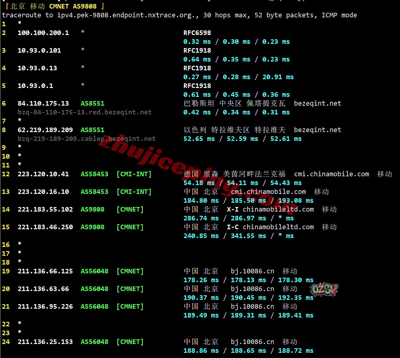 移动回程:内网出来接bezeqint去德国,从移动德国CMI节点直连回国