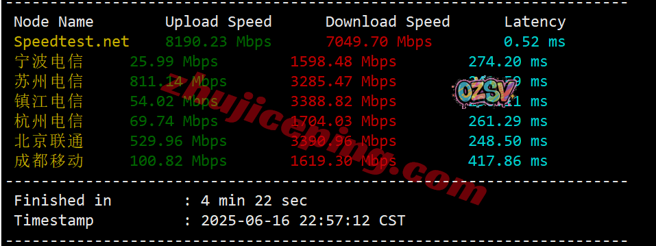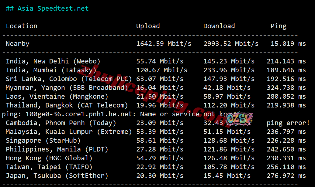 SpeedTest.Net的部分亚洲境内的节点的带宽上下行测试数据: