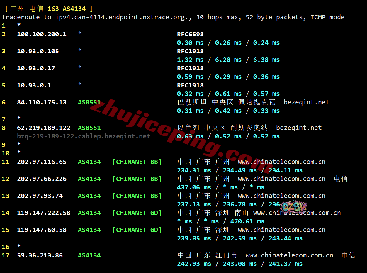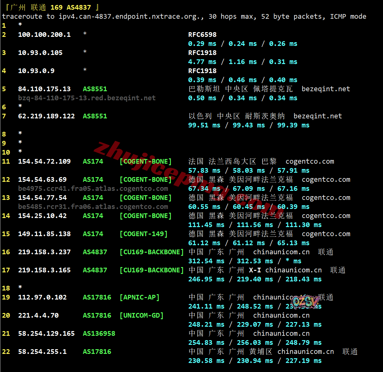 广州方向:走bezeqint去法国接cogent经过德国出海回国
