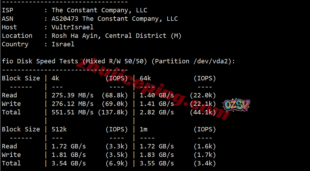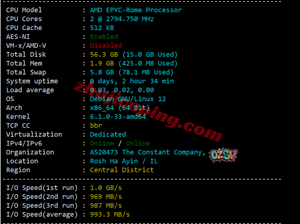 云服务器用的CPU具体型号不知道,只知道是AMD EPYC 7002系列,主频2794.750MHz,站长开启了BBR,支持IPv4&v6,上游The constant company其实就是vultr自家母公司,归属地Rosh Haayin(罗斯艾因城),当前I/O测试大致993MB/S:
