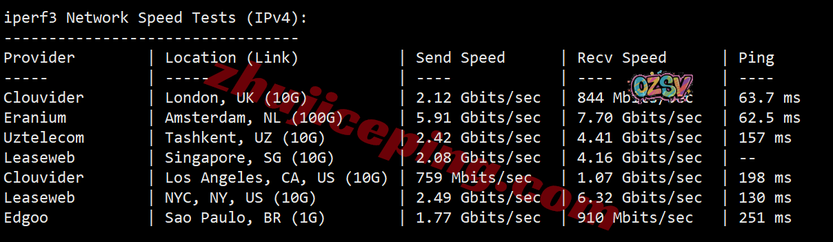 IPv4环境下,IPERF3测试,几个热门节点的测试效果如下: