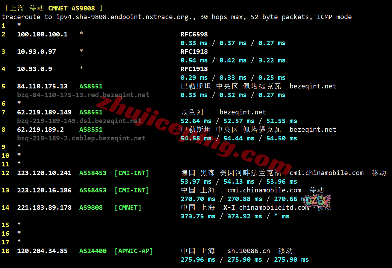 移动去程:直连移动德国法兰克福节点,然后接bezeqint直接去了以色列