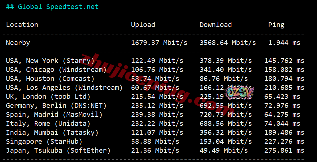 SpeedTest.Net的部分国际热门节点的带宽上下行测试数据: