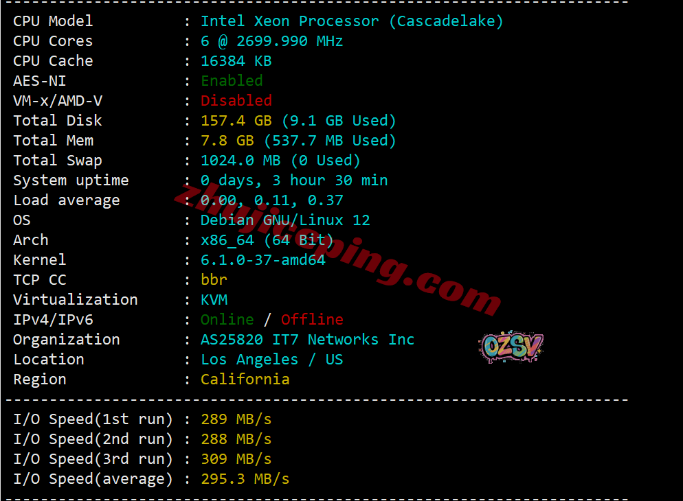 服务器CPU未知,主频2.7GHz,当前官方已经在升级服务器硬件的过程中了,部分机房以及切换到了AMD EPYC+NVMe SSD阵列平台… VPS底层为KVM虚拟,系统模板自动开启BBR,不支持IPv6(需要去后台自己动手开启才可以),搬瓦工自己的网络,归属地洛杉矶,当前测试I/O大致在295MB/S: