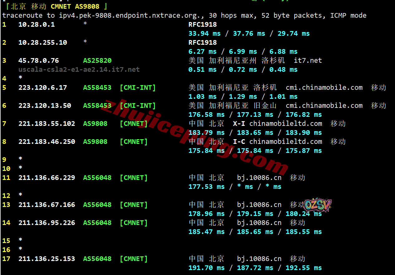 北京方向:机房出来接移动洛杉矶CMI节点然后去移动旧金山CMI节点直连出海回国