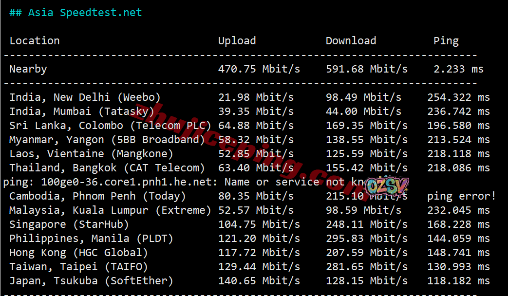 SpeedTest.Net的部分亚洲境内的热门节点的带宽上下行测试数据: