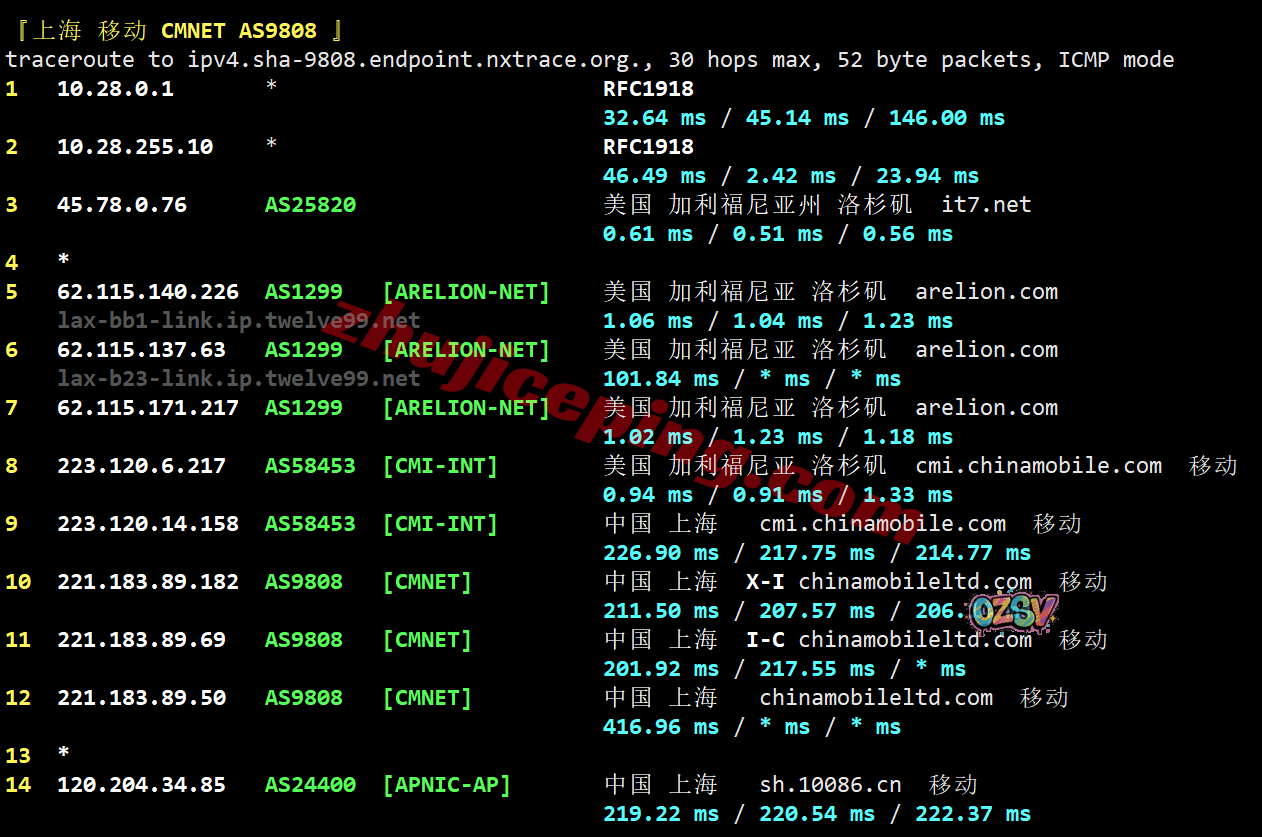 上海方向:机房出来接telia然后转移动洛杉矶CMI节点出海直连回国