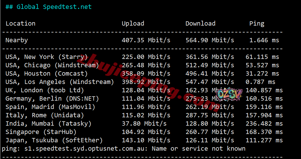 SpeedTest.Net的部分国际热门节点的带宽上下行测试数据:
