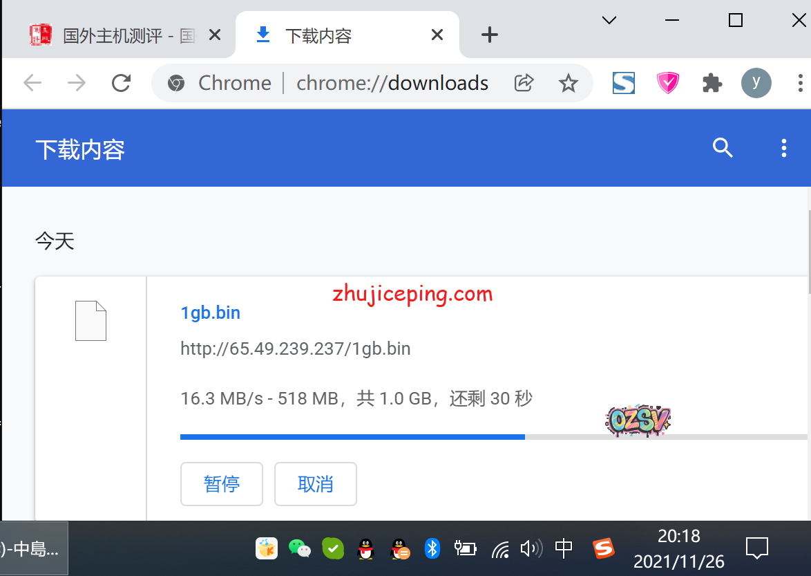 存放在测试的VPS上的数据文件,站长是广州电信,直接本地用Chrome浏览器下载,速度大致在16.3MB/S,这效果实在是爽歪了: