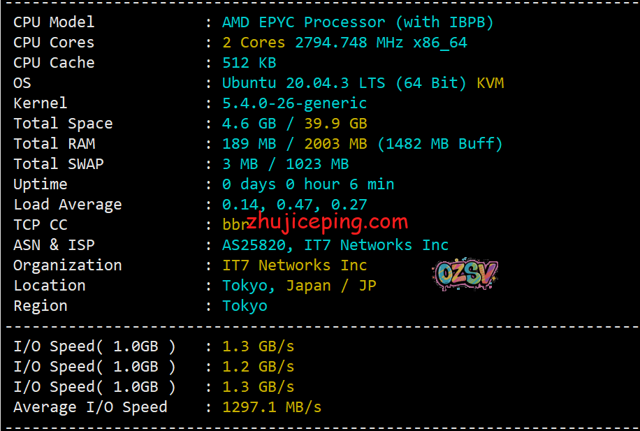 让人比较惊喜的是搬瓦工日本cn2 gia vps换了全新的AMD平台的硬件,用的搬瓦工自己的IP广播的,站长顺手开启了BBR,硬盘I/O大致在1.3GB/S的样子: