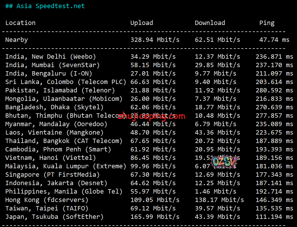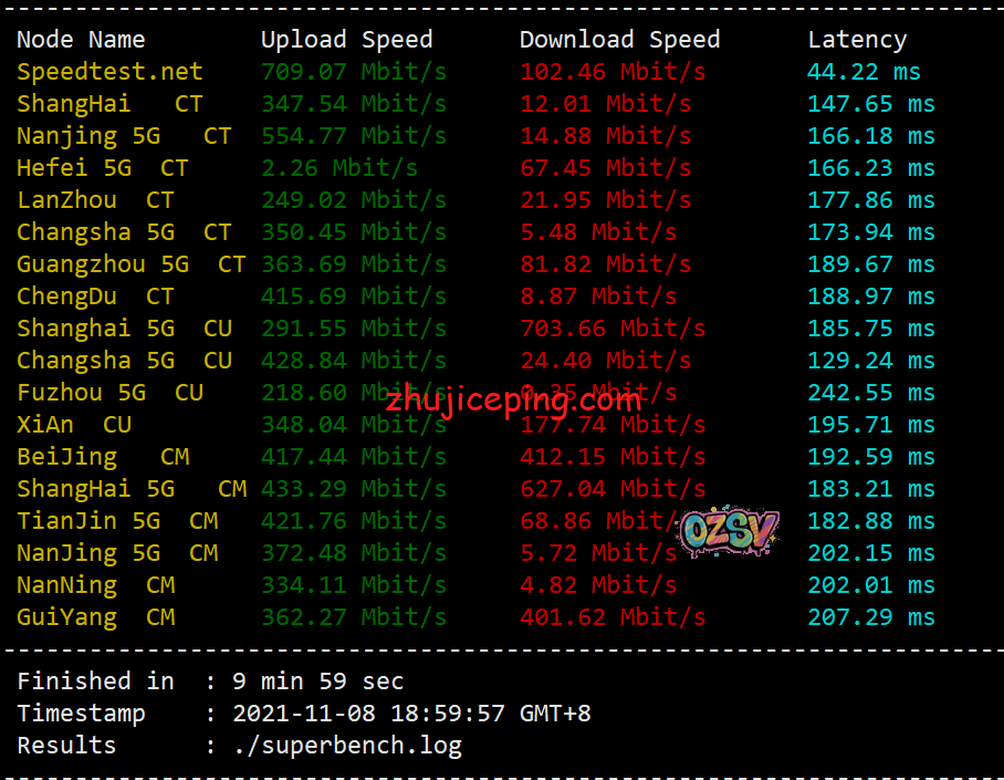 speedtest.net的国内电信、联通、移动的不同节点来测试下racknerd这款VPS在国内网络大致能跑到多少,注意看看上行和下行的速度数字: