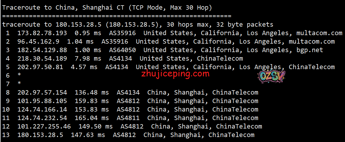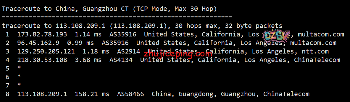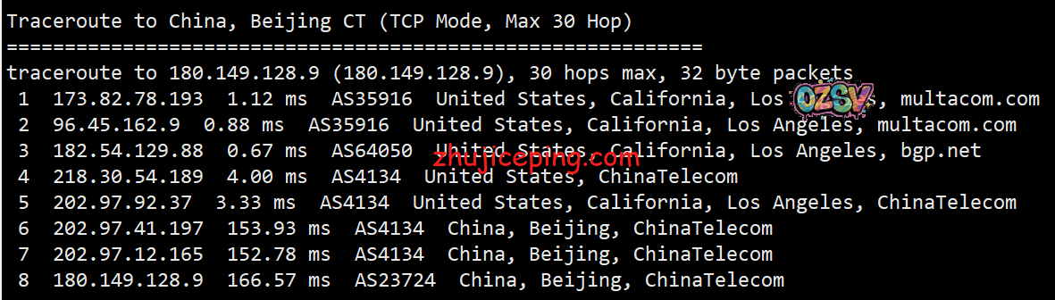 回程,到国内电信:机房到中国电信洛杉矶节点后直接回国