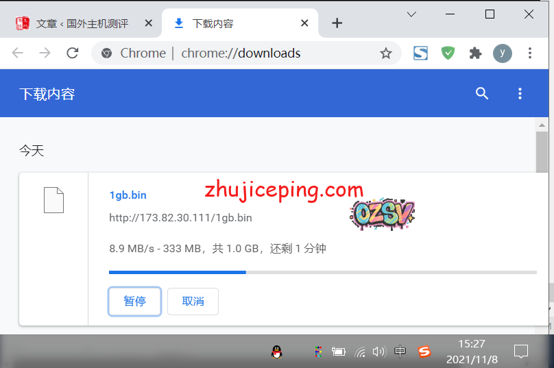 广州电信,测试用Chrome直接下载VPS上存着的一个文件,速度大致在8.9MB/S: