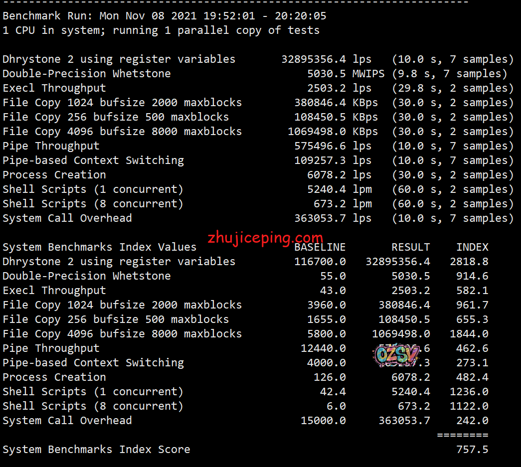最后来测试一下Unix bench,单核757份,中等情况吧: