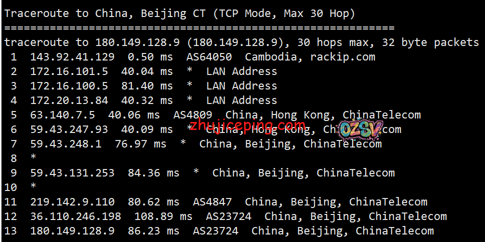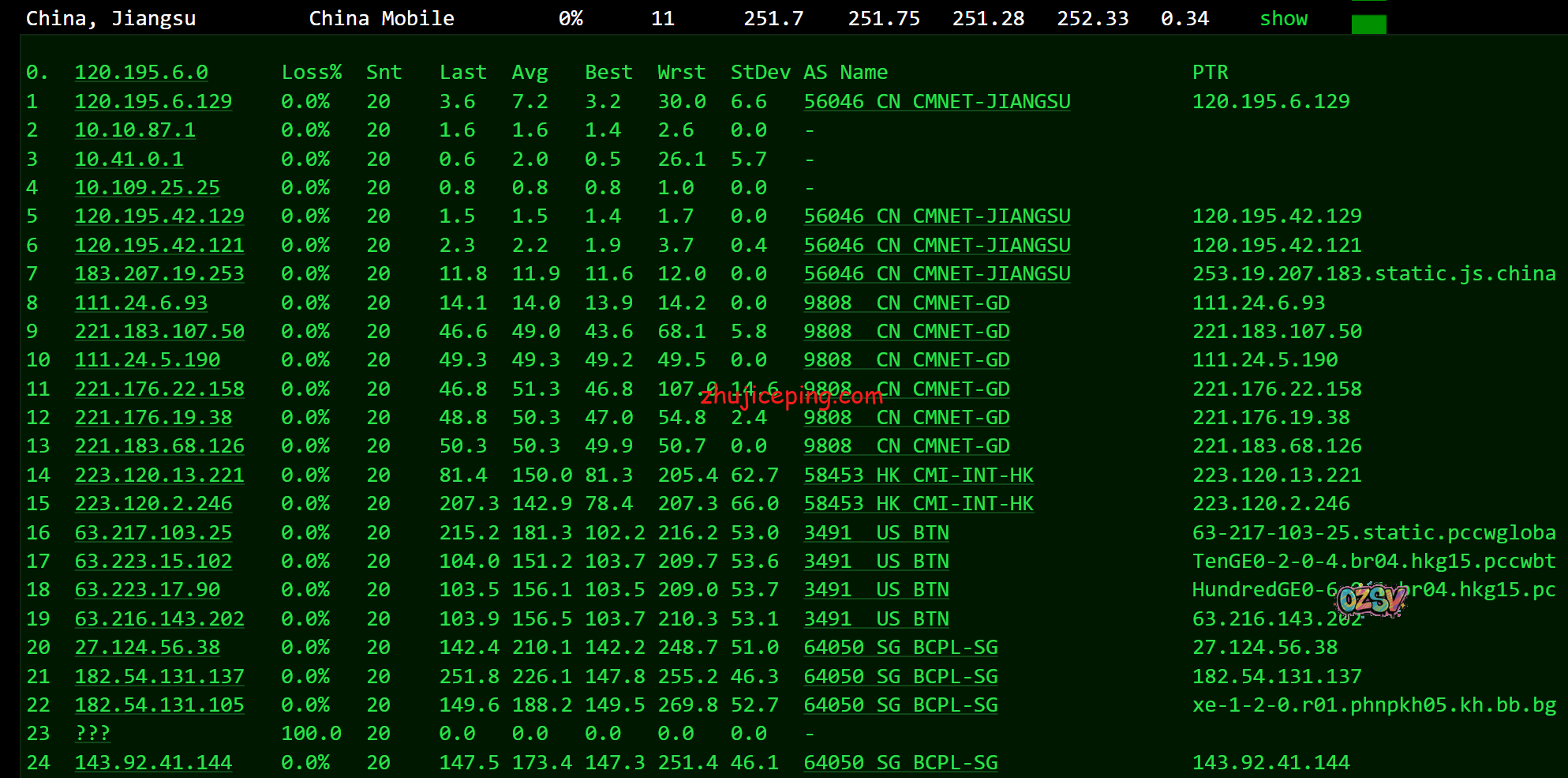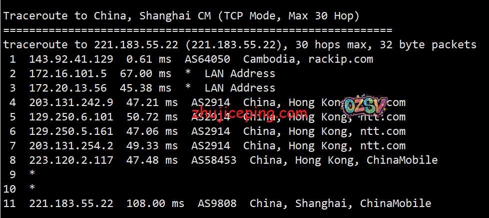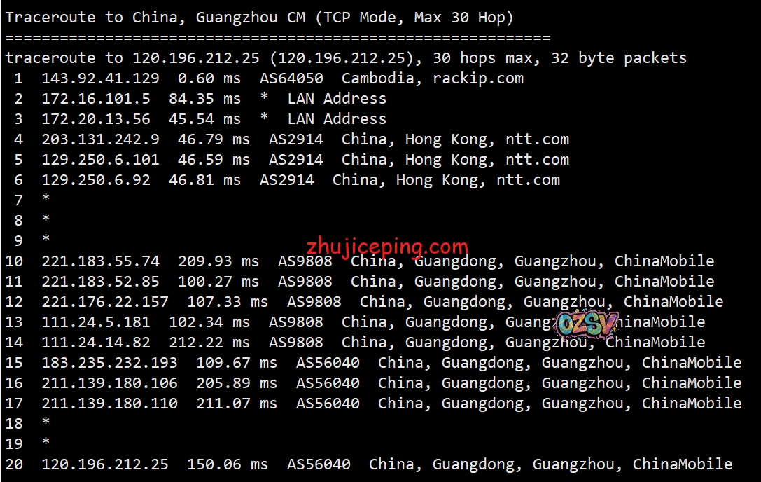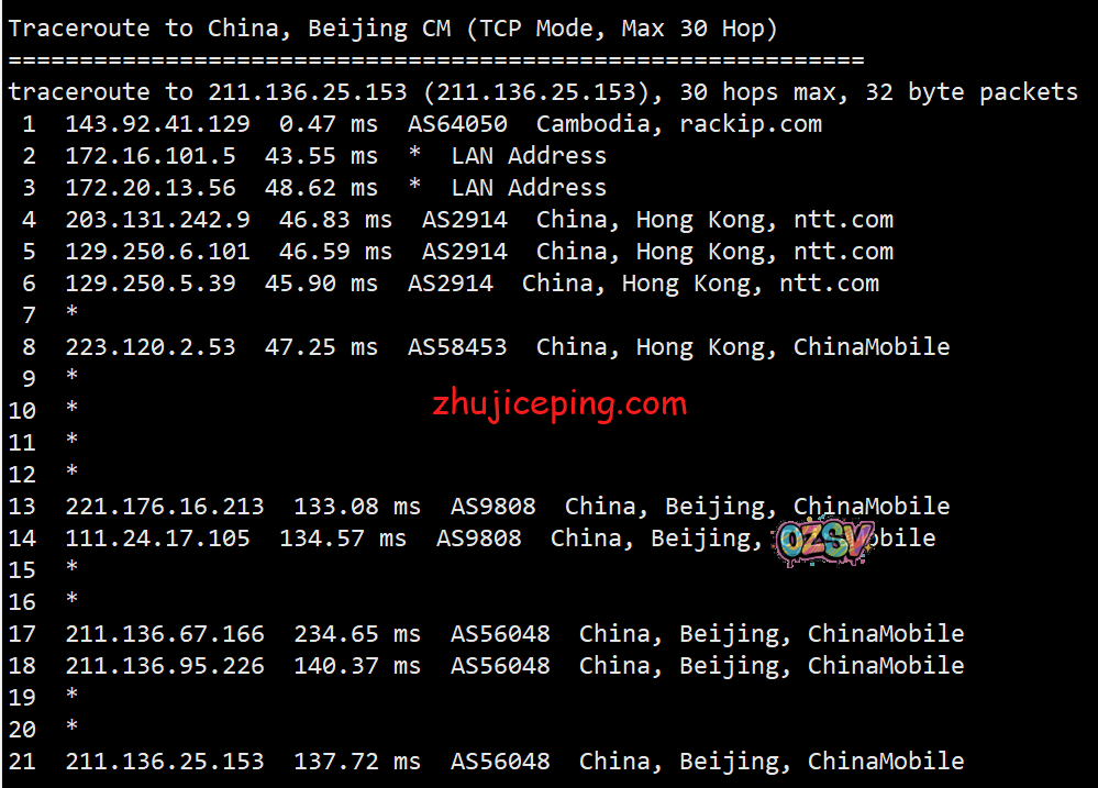 回程,到国内移动:柬埔寨到想NTT转香港移动节点后直连回来