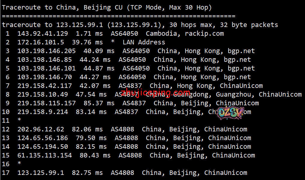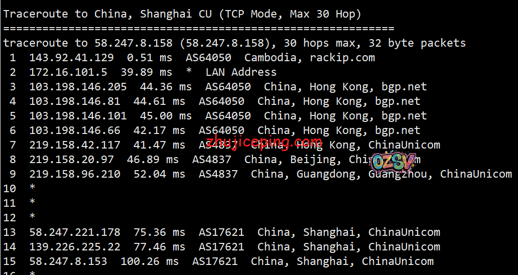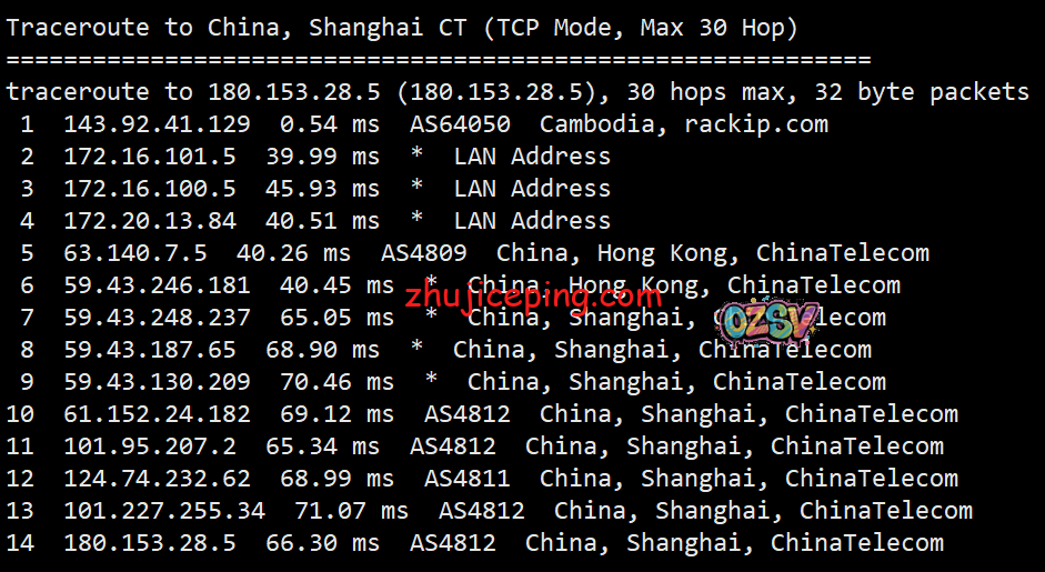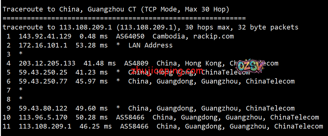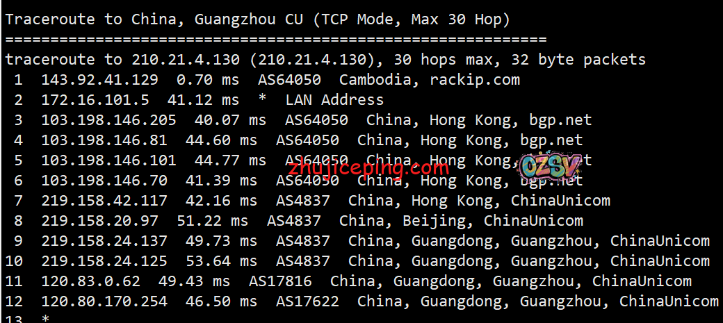 回程,到国内联通:柬埔寨到香港联通节点后直连回来