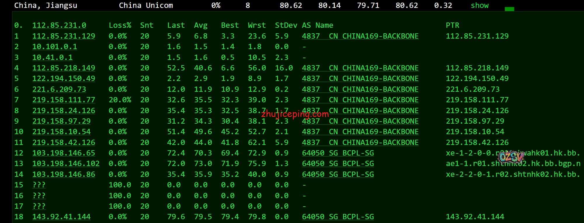 回程三网都给力,电信是CN2、联通和移动都是走自己在香港的节点直连回来的。