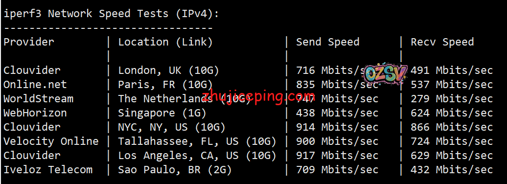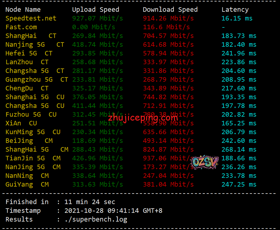 默认写的是1Gbps带宽,我们通过speedtest.net提供的国内三网节点测试下上行、下行带宽看看国内到底能跑到多少,数据如下: