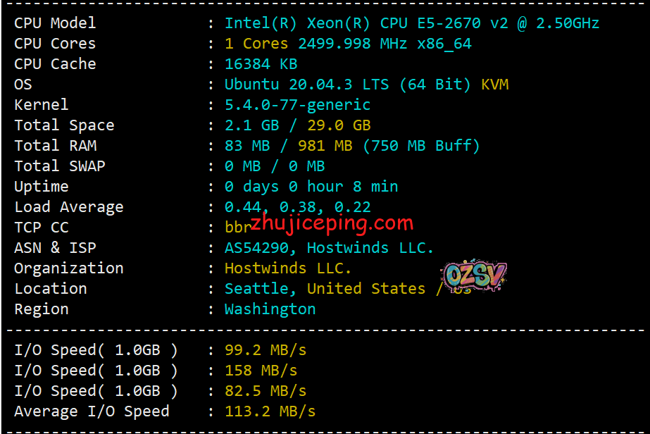 站长开通了一个,最低配的,拿到的CPU型号是e5-2670v2,测试大致硬盘I/O在112MB/S: