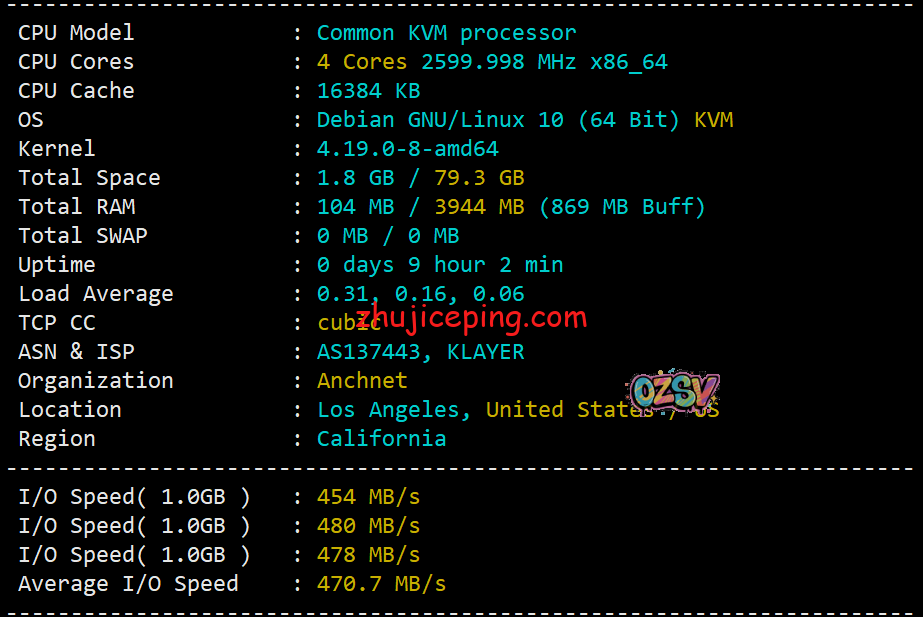 本次给大家做测试用的是4G内存这款,4核、80G SSD、300Mbps带宽… 主频大致2.6GHz,硬盘I/O大致在470MB/S: