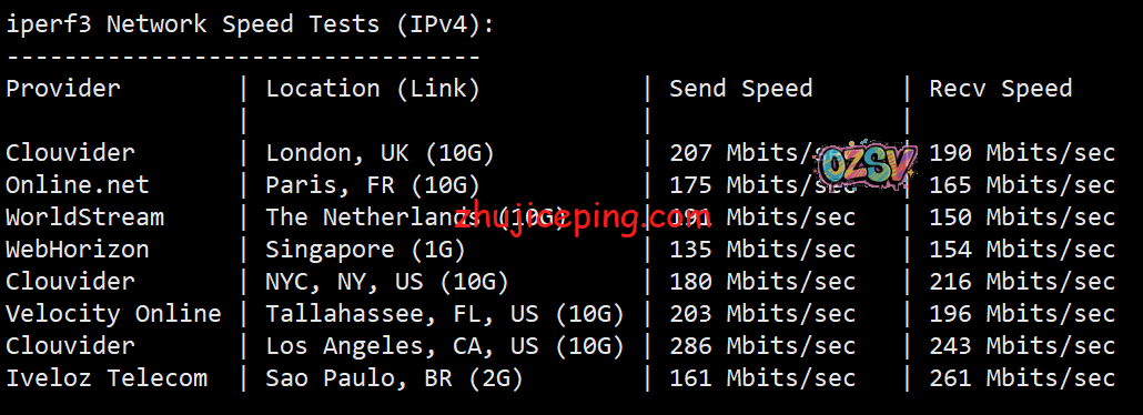 iperf3跑欧美的效果。从这里来看发现可能是服务器本身的带宽已经有一定的负载导致的跑不满,前面来国内的晚高峰效果差了一些可能与晚高峰测试期间服务器带宽的本身负载已经上涨了有关: