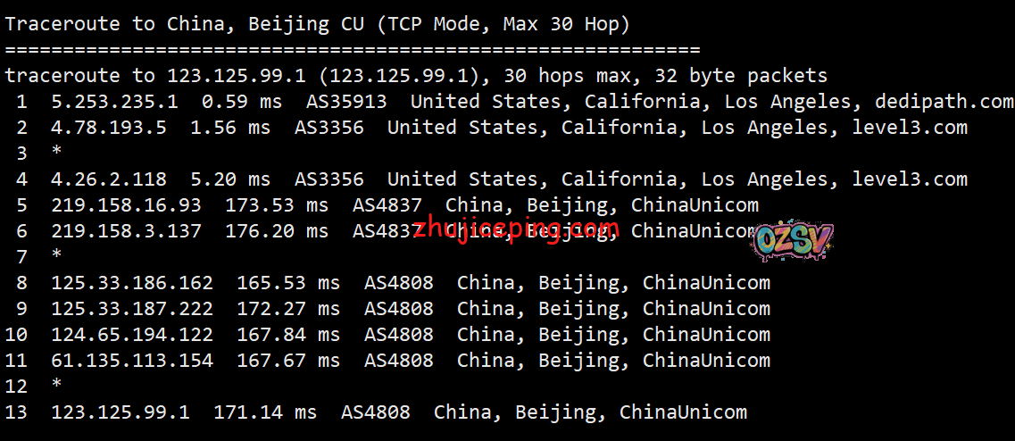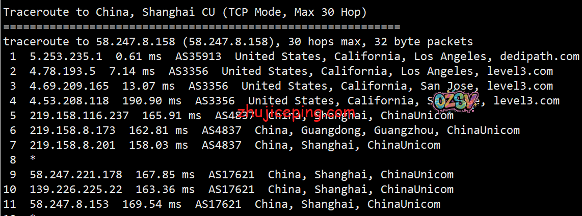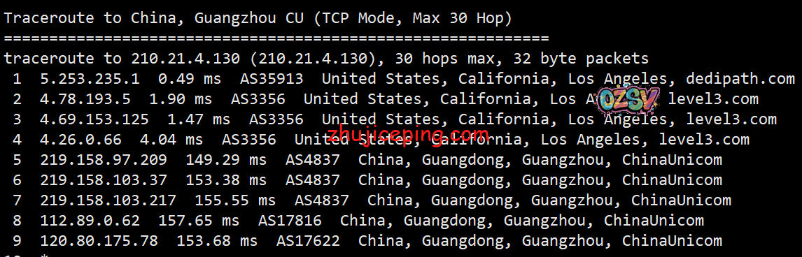 回程,到国内联通:洛杉矶Level3对接联通AS4837回国