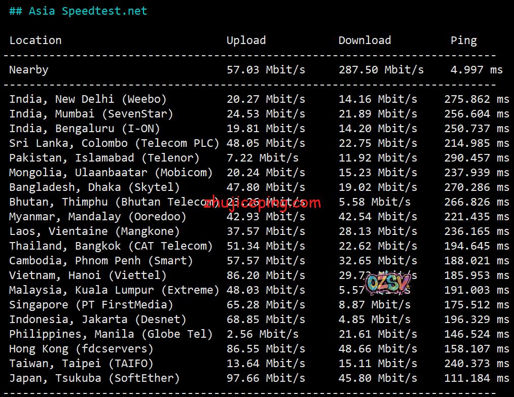 亚洲区域内的其他节点测试: