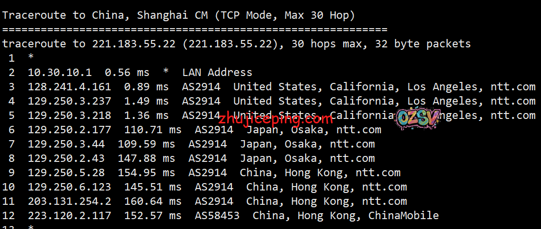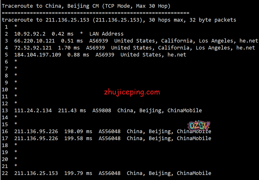 回程,到国内移动:北京方向从洛杉矶HE线路对接移动AS9808回国,上海方向是从洛杉矶NTT到日本大阪NTT然后到香港NTT转中国移动香港节点接着再回来
