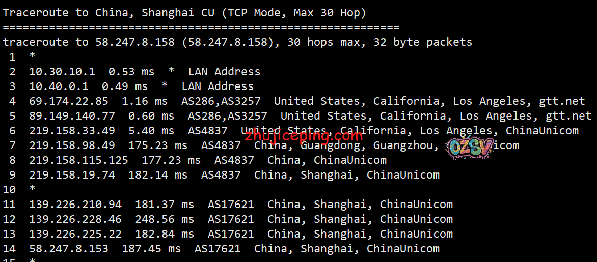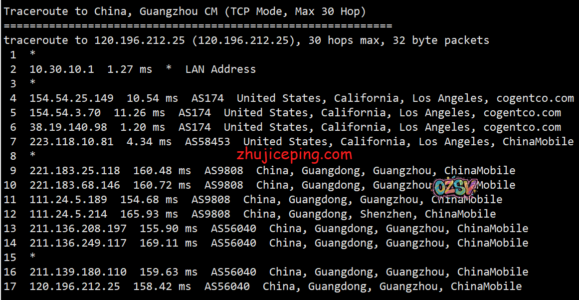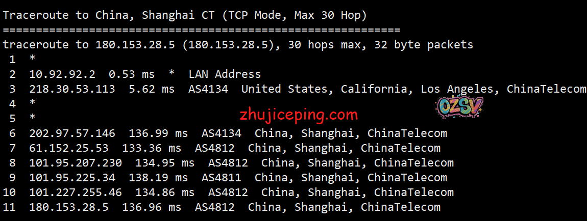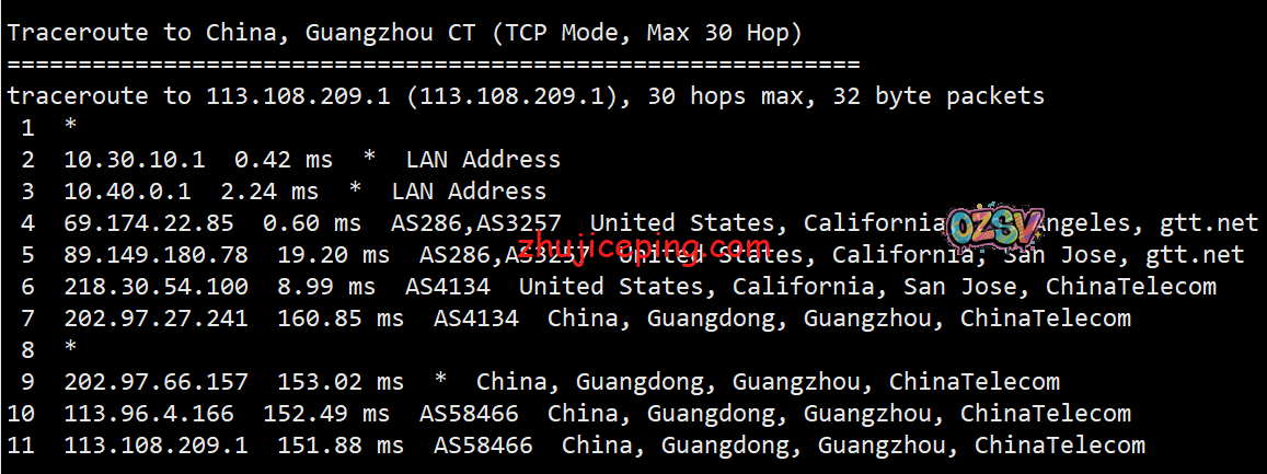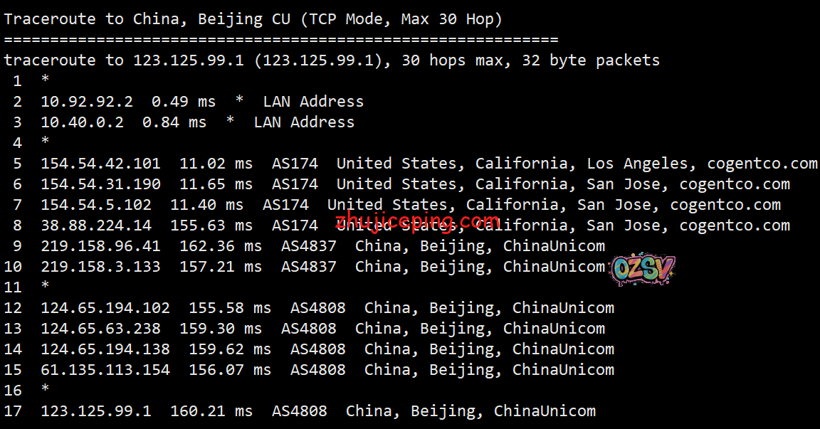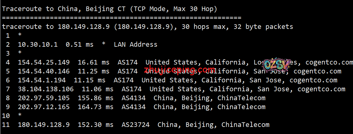 回程,到国内电信:北京方向是从洛杉矶出来到圣何塞走cogentco然后回国,上海方向是洛杉矶电信节点直连回国,广州方向是洛杉矶到圣何塞电信节点然后直连回国。大致来说除了北京方向差点儿之外,其余的都还行。