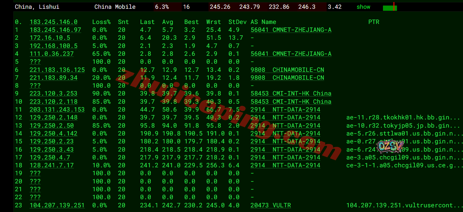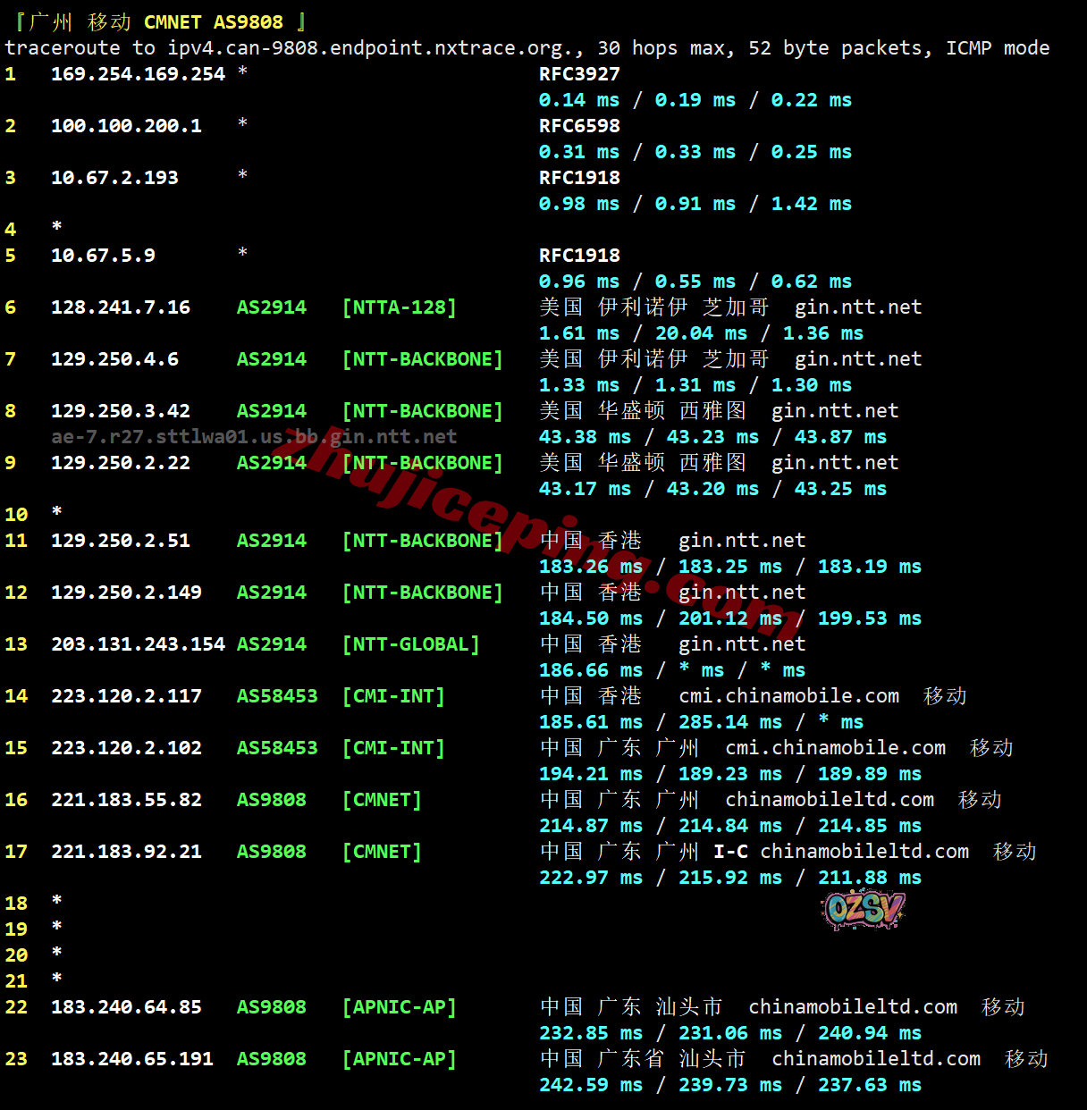 移动去程:直连香港CMI节点,然后转香港NTT去日本、美国西雅图图、芝加哥