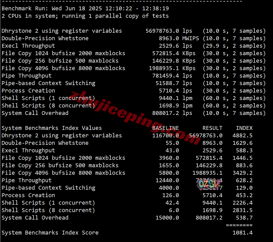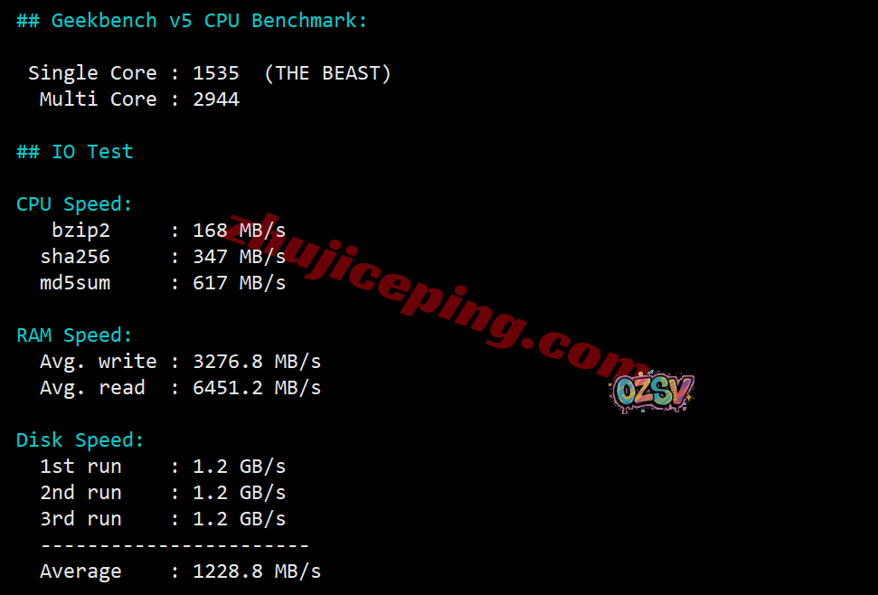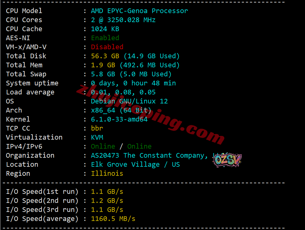 从下图所示来看,虽然服务器所用的具体CPU型号不知道,但是显示的是AMD EPYC 9004高端货,主频3250.028MHz(盲猜是9354或者9354P),底层为KVM虚拟,站长启用了BBR,上游The constant company其实就是自家母公司,归属地“伊利诺伊州埃尔克格罗夫村”,当前实测I/O数据大致在1160MB/S: