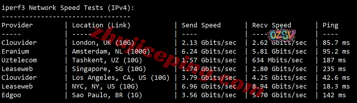 IPv4环境下,IPERF3测试,几个国际节点的实测效果: