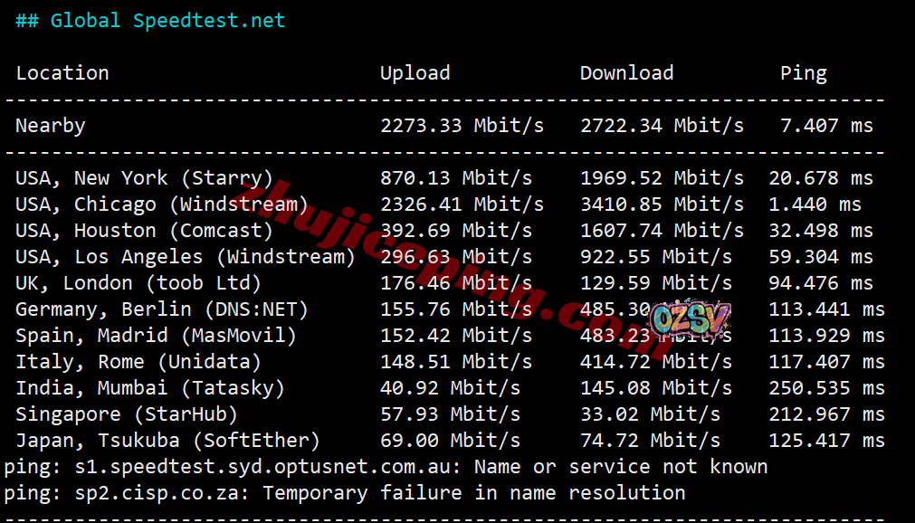 SpeedTest.Net的部分国际热门节点的带宽上下行测试数据: