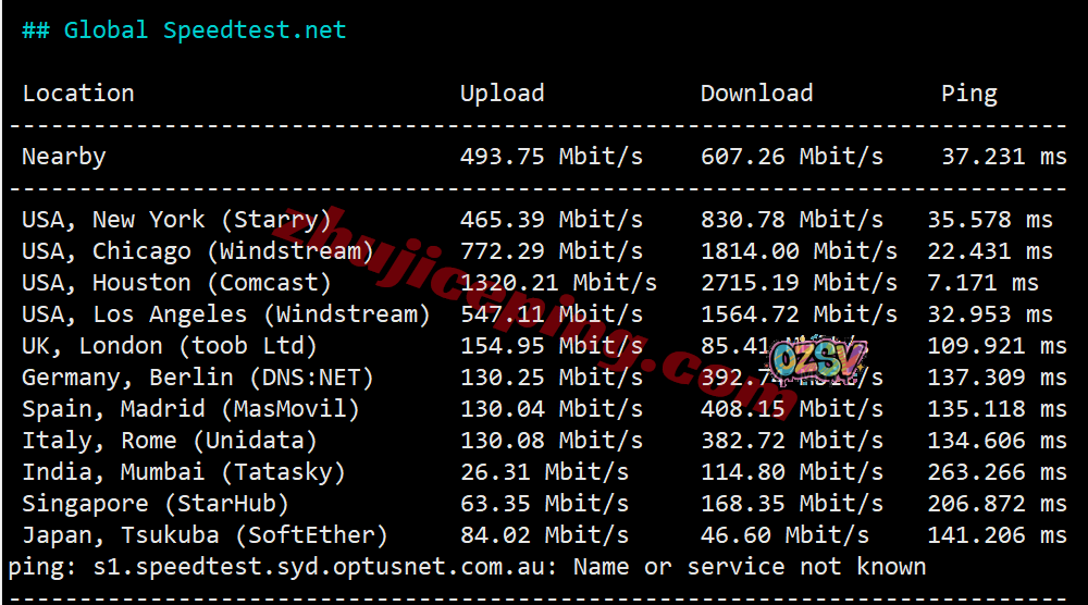 SpeedTest.Net的部分国际节点的带宽上下行测试数据: