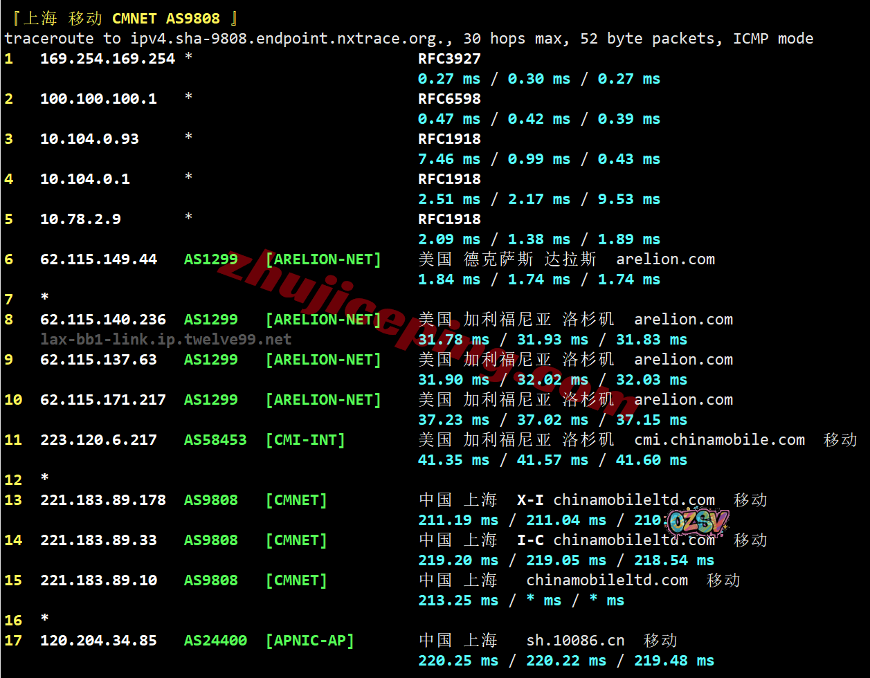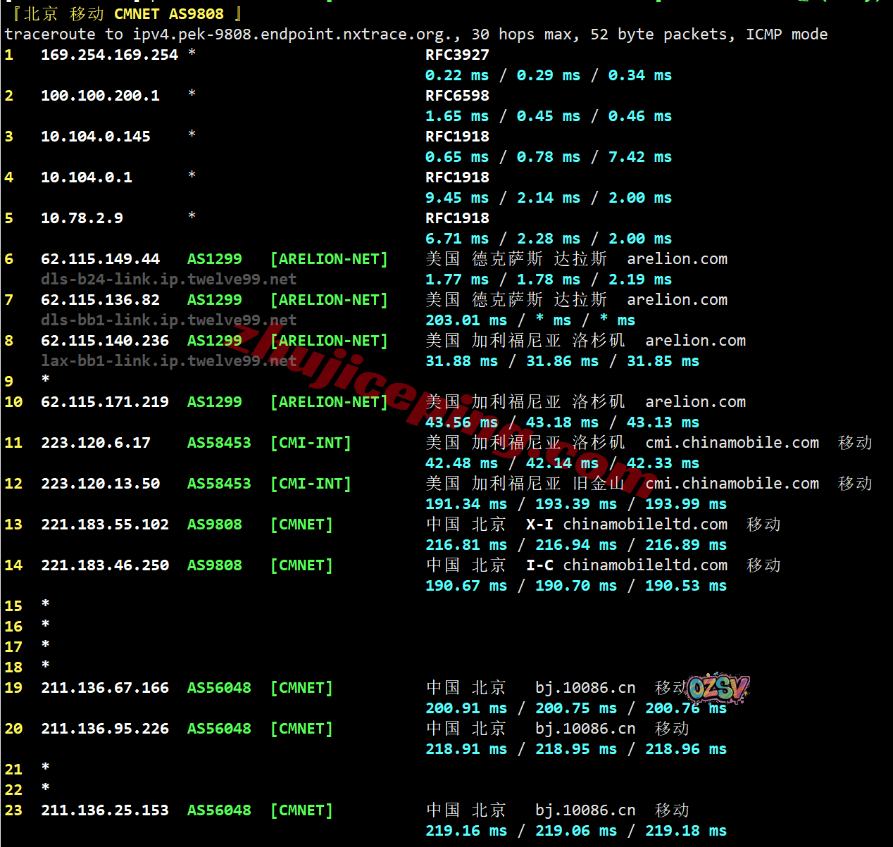 北京、上海方向:走telia去洛杉矶,然后转移动CMI节点直连回国