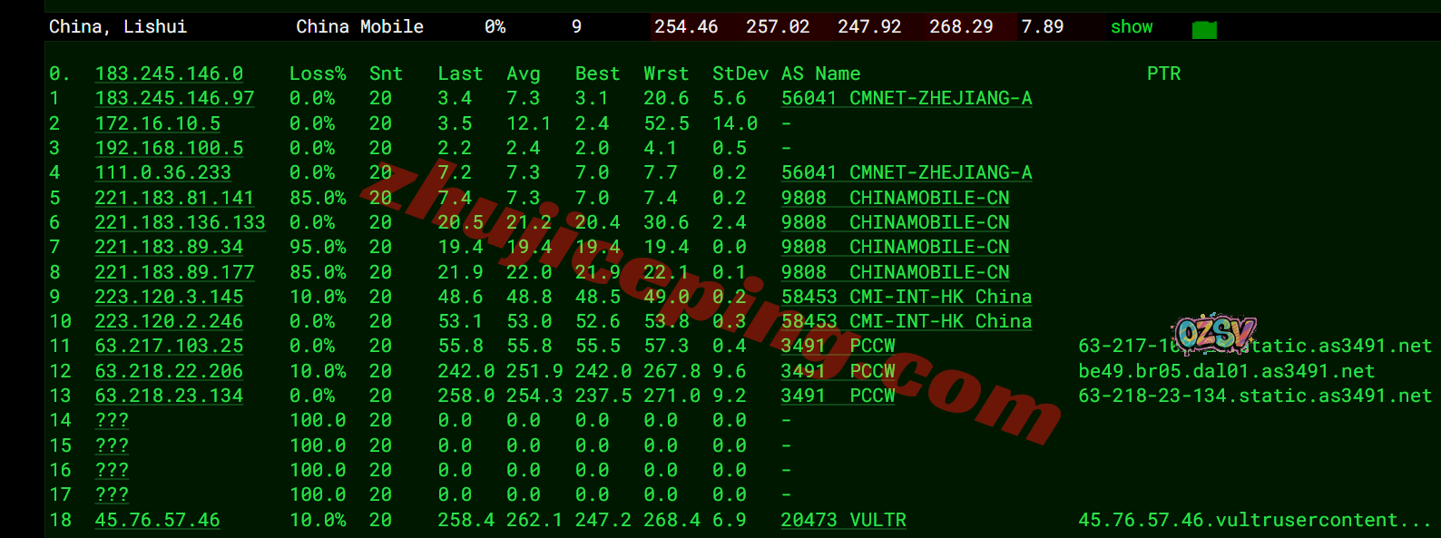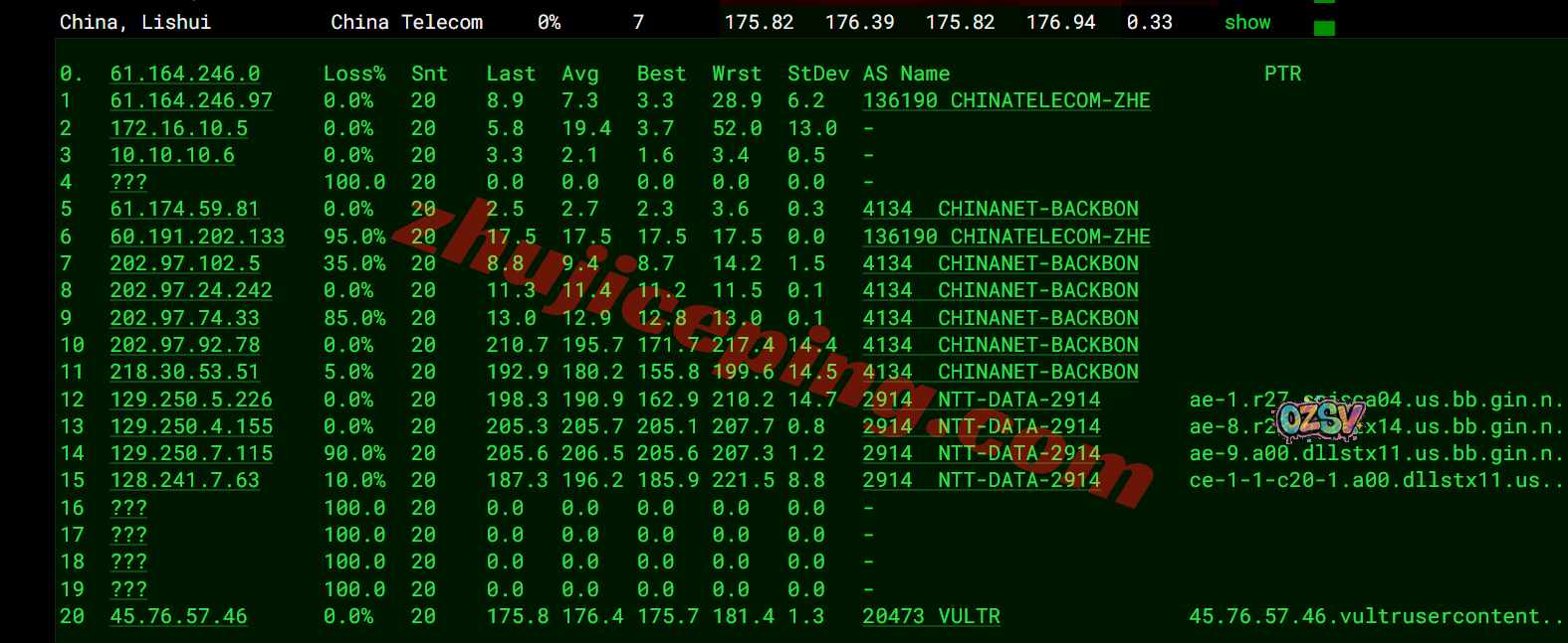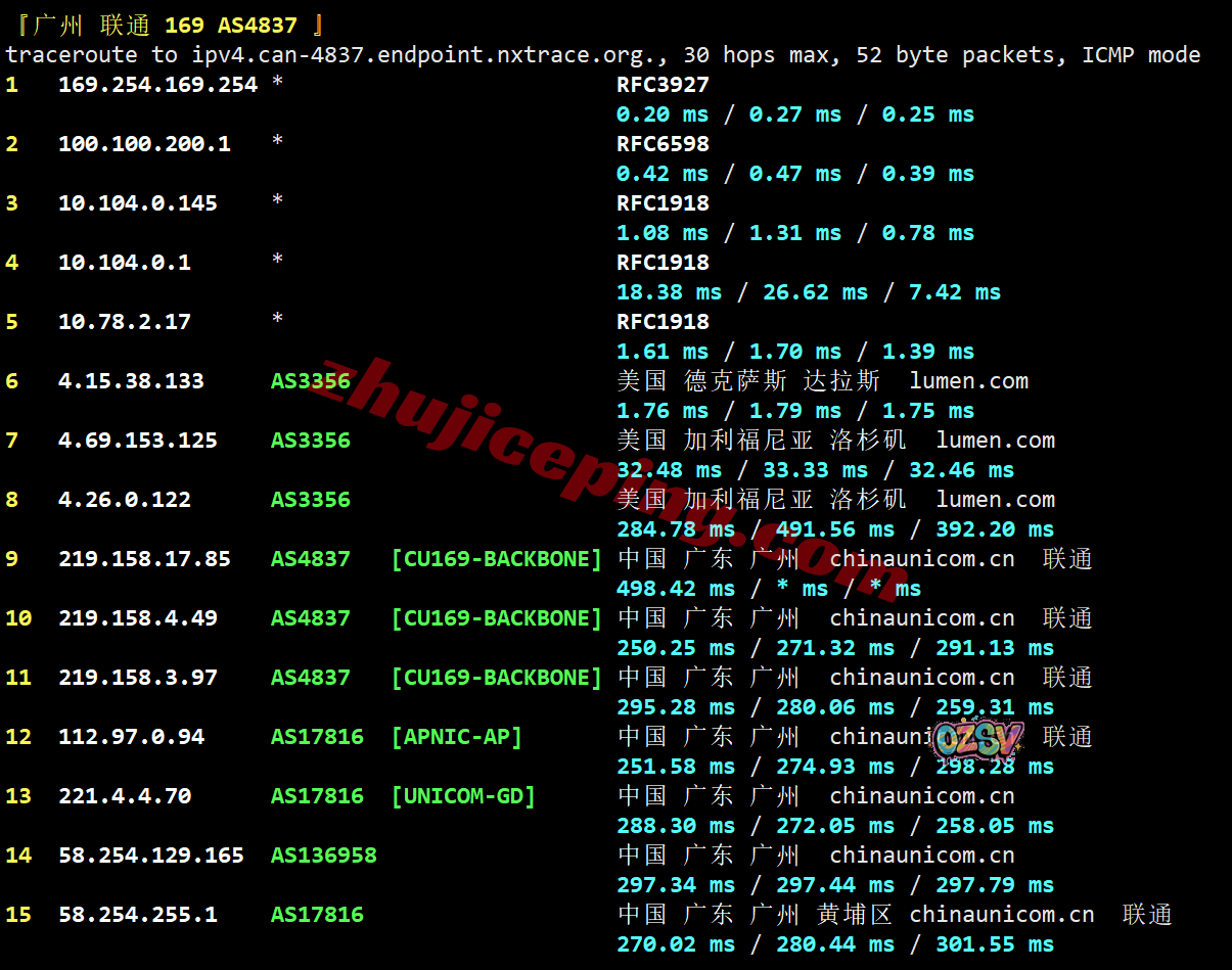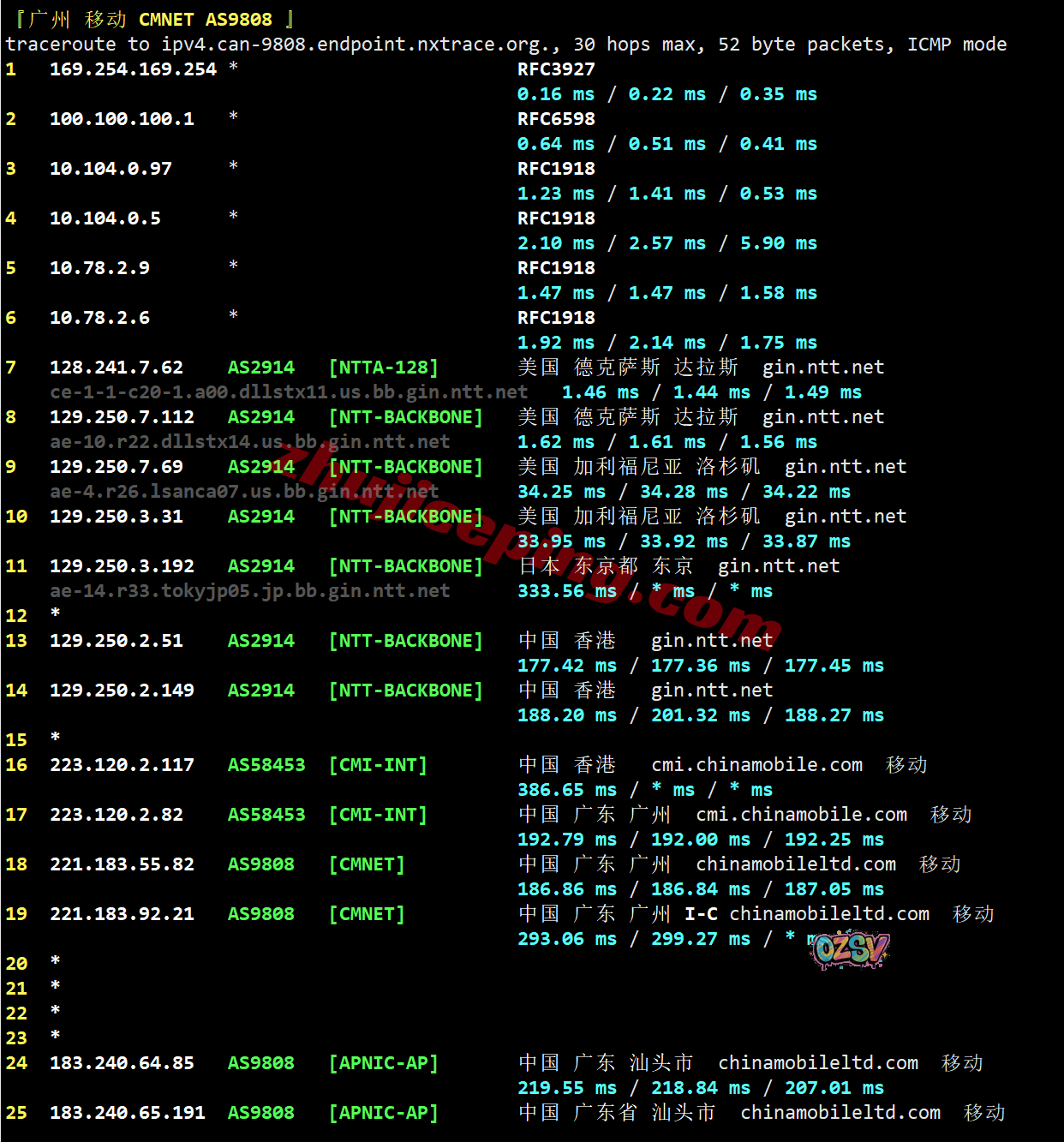 广州方向:走NTT去洛杉矶然后去日本再去香港,然后转移动CMI直连回内地