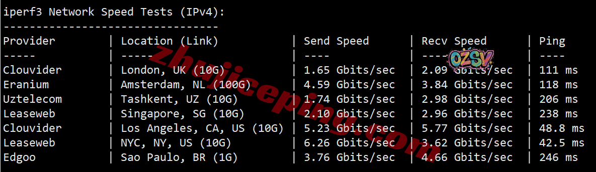 IPv4环境下,IPERF3测试,几个热门的国际节点的实测数据如下: