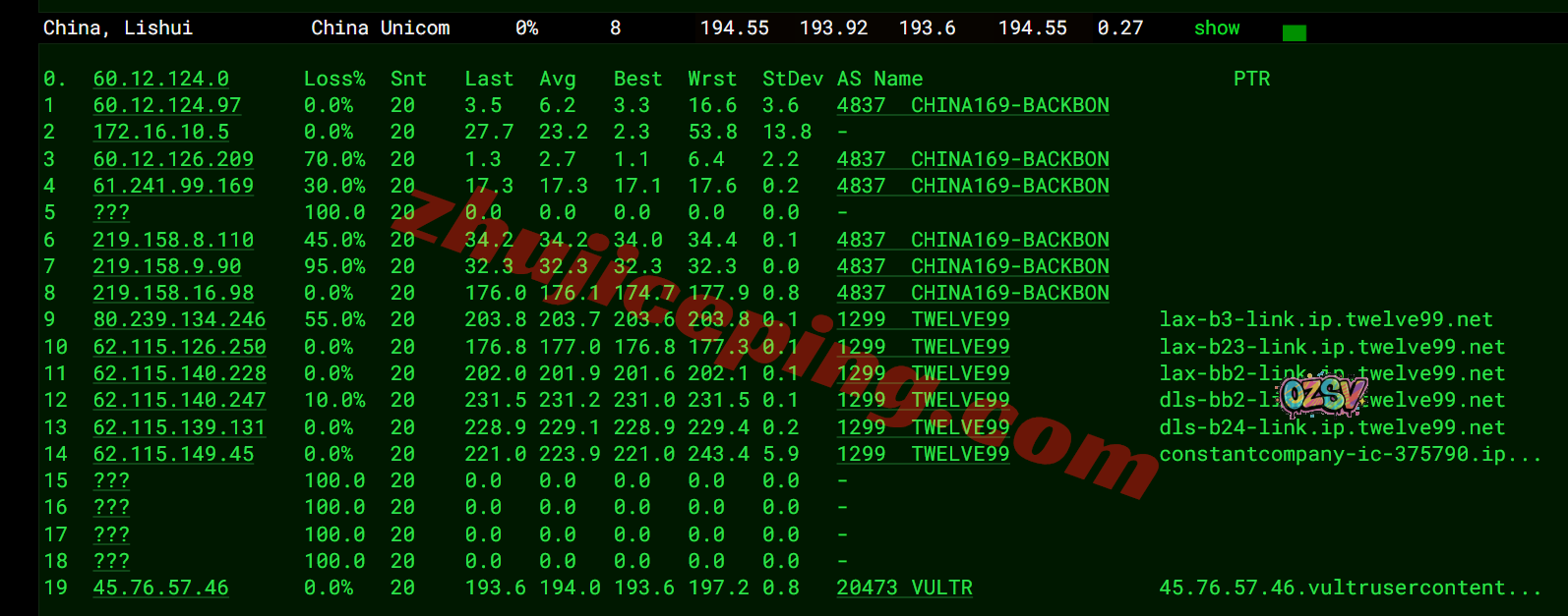 联通去程:直连联通洛杉矶节点,然后接telia去达拉斯