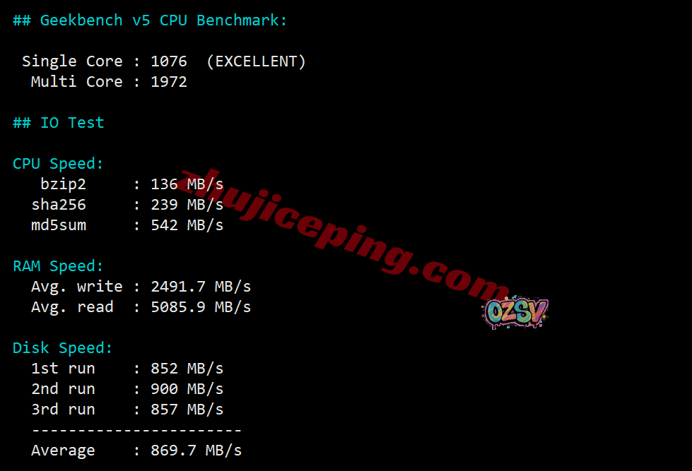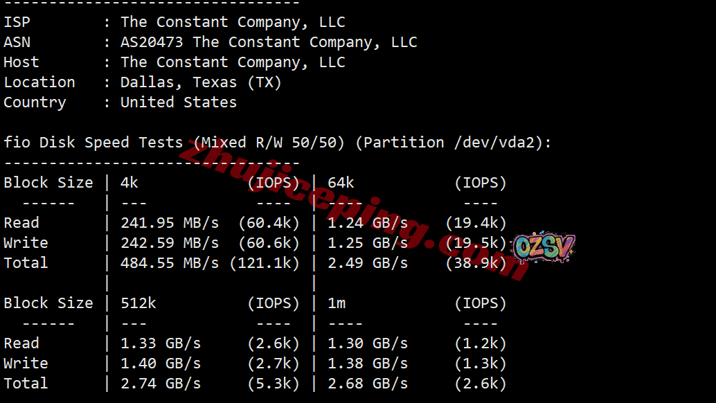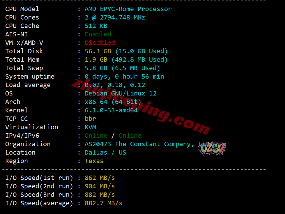 服务器用的CPU具体型号未知,大致就是AMD EPYC 7002,主频2794.748MHz,底层为KVM虚拟,站长启用了BBR,支持IPv4&v6,上游The constant company为Vultr自己的母公司,归属地美国达拉斯,当前I/O实测大致882MB/S: