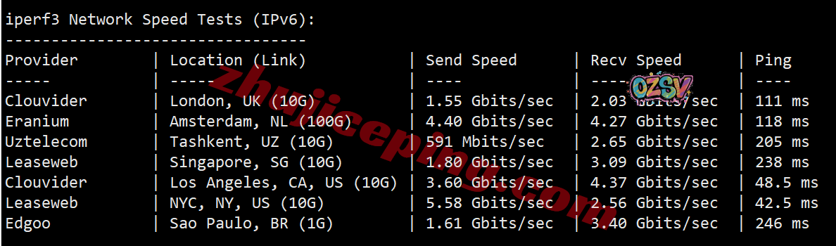 IPv6环境下,IPERF3测试,几个热门的国际节点的实测数据如下: