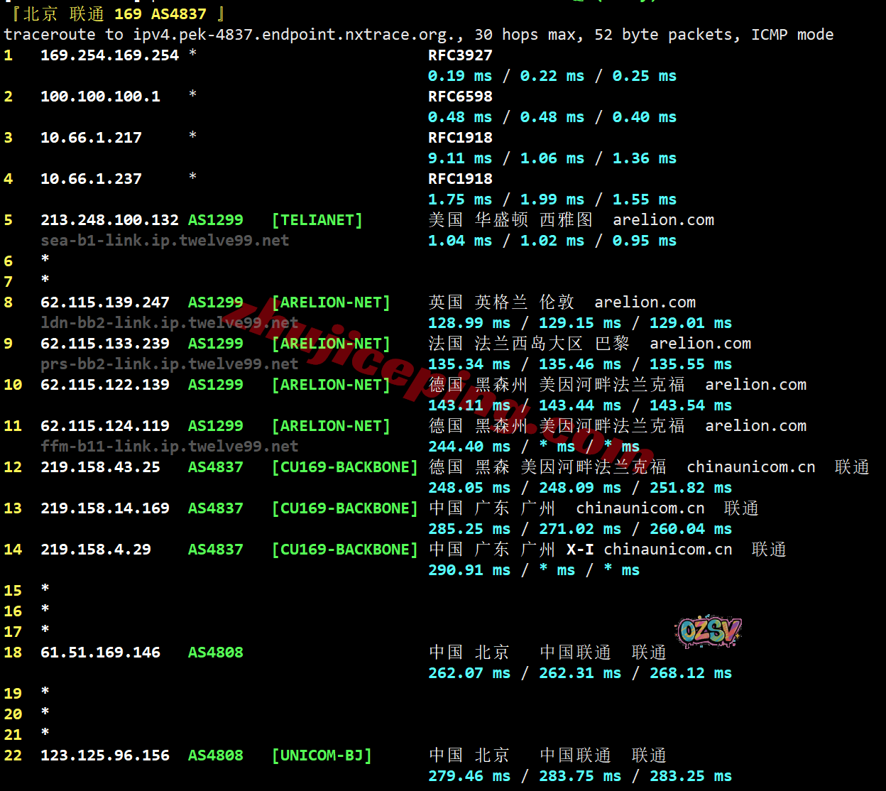 北京方向:走telia直接出海去英国、法国、德国,从联通德国法兰克福节点直连回国