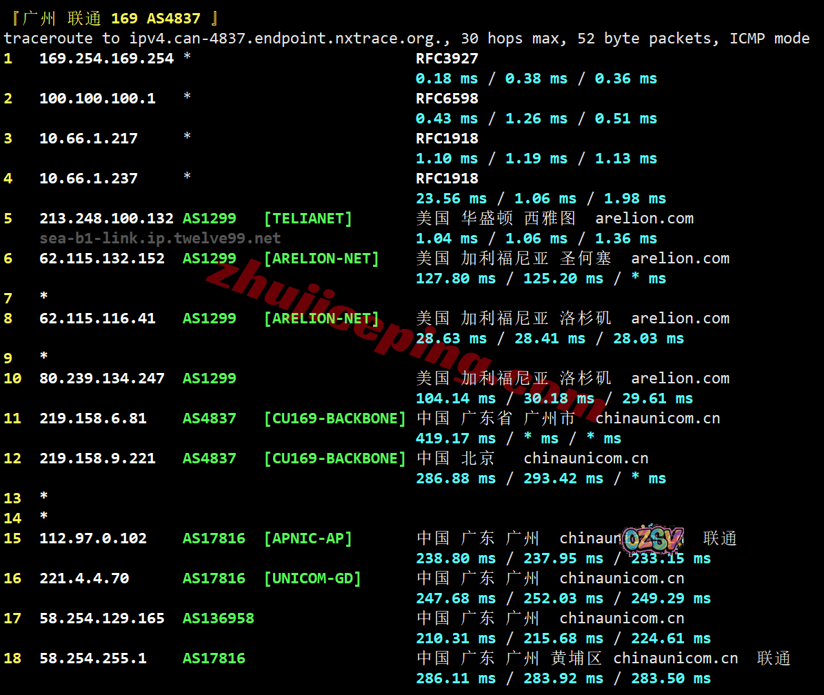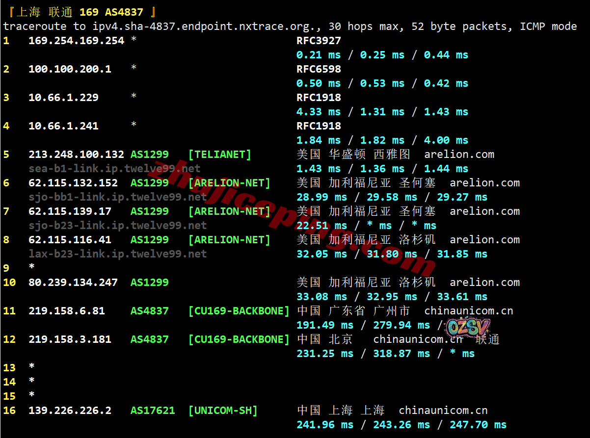联通去程:直连联通美国洛杉矶节点然后接telia经过帕洛阿尔托、圣何塞去西雅图