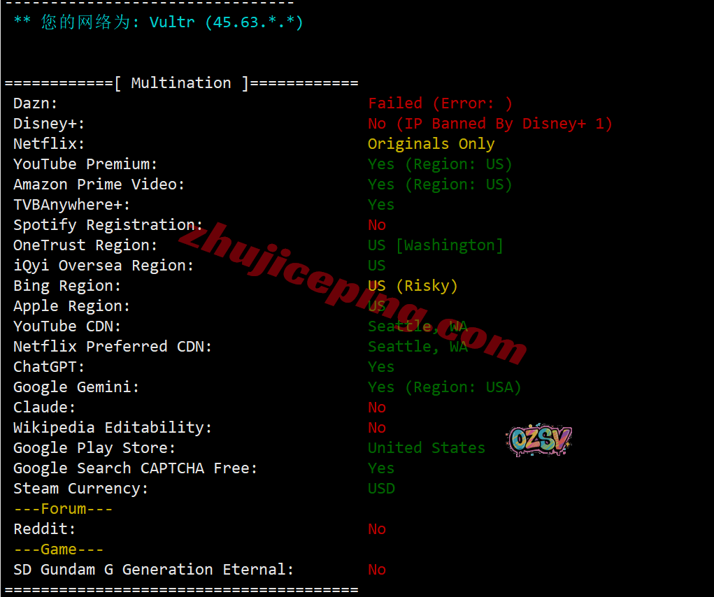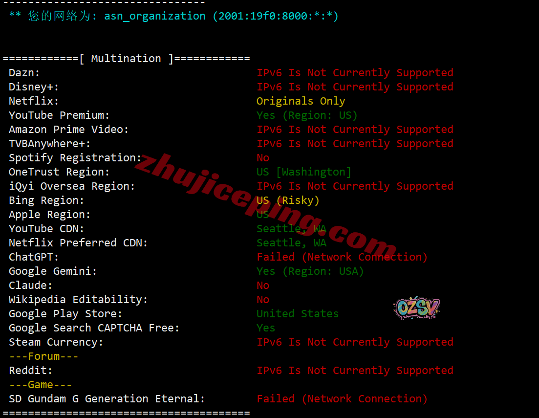 IPv4和IPv6均为美国原生IP,其中IPv4能解锁不少东西,IPv6的解锁效果就差太多了;