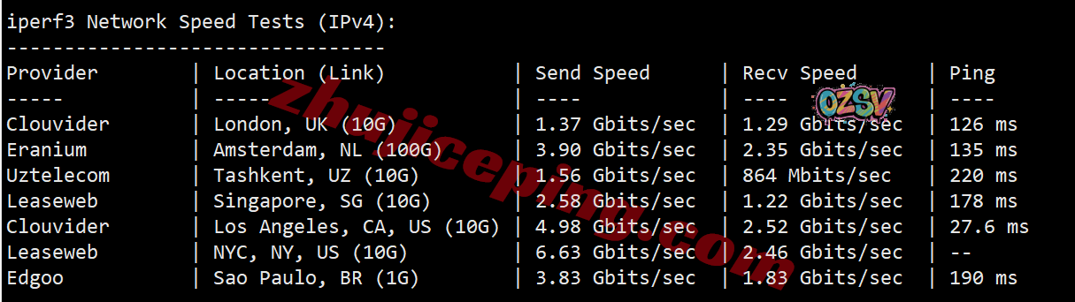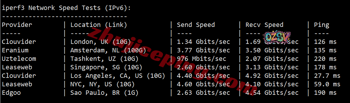 IPv6环境下,IPERF3测试,几个热门节点的实测效果:
