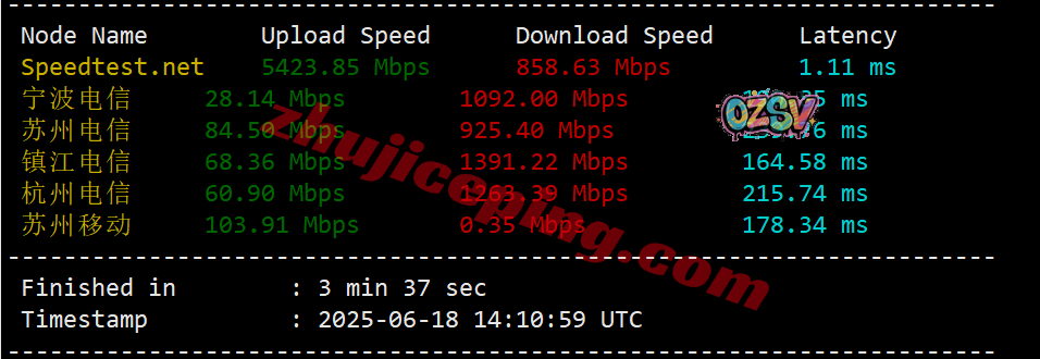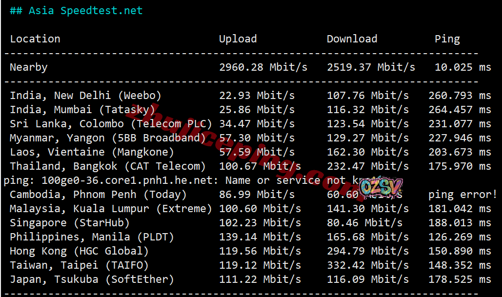 SpeedTest.Net的部分亚洲节点的带宽上下行测试数据: