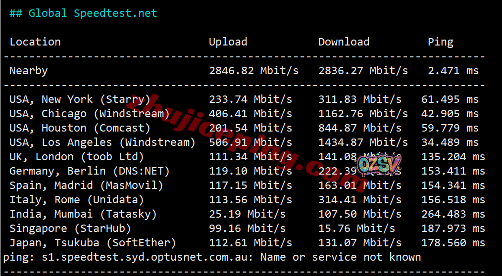 SpeedTest.Net的部分国际热门节点的带宽上下行测试数据: