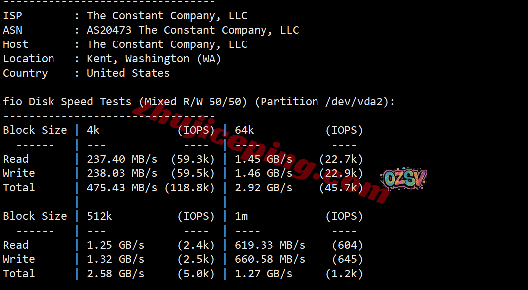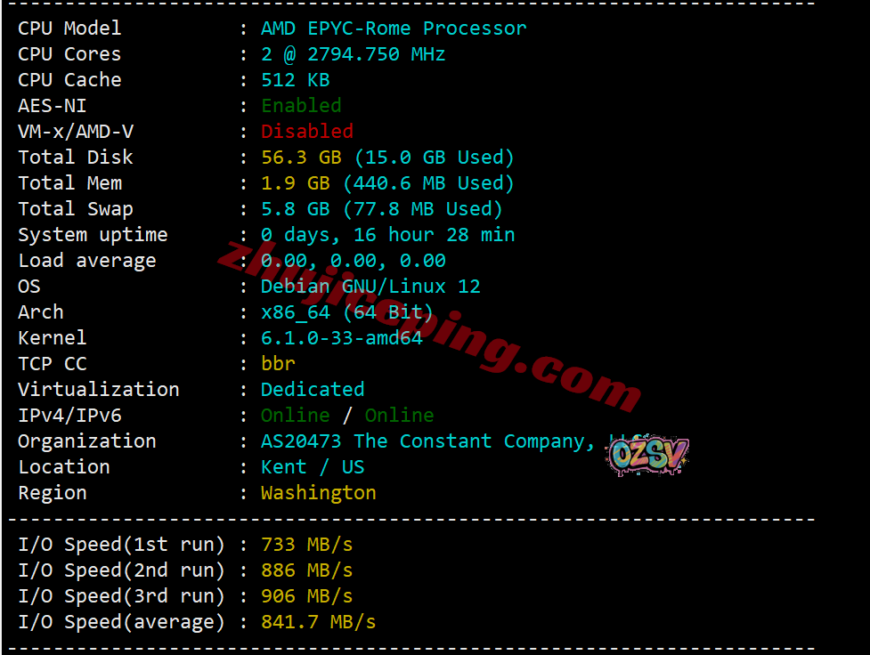服务器用的CPU大致是AMD EPYC 7002系列中的某一款,主频2794.750MHz,底层KVM虚拟,站长启用了BBR,支持IPv4&v6,上游The constant company就是自己的母公司,归属地为美国华盛顿州肯特市(位于西雅图与塔科玛市之间),当前I/O实测大致在841MB/S的样子: