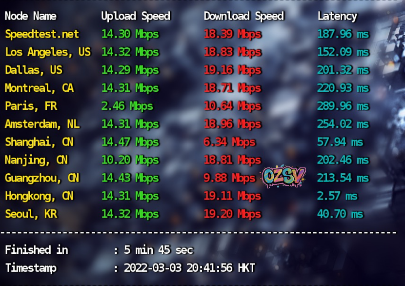 服务器的上行带宽和下行带宽在全球测试能跑到多少这是个非常重要的参数,我们用speedtest.net的全球区节点测试一下,注意看下测试